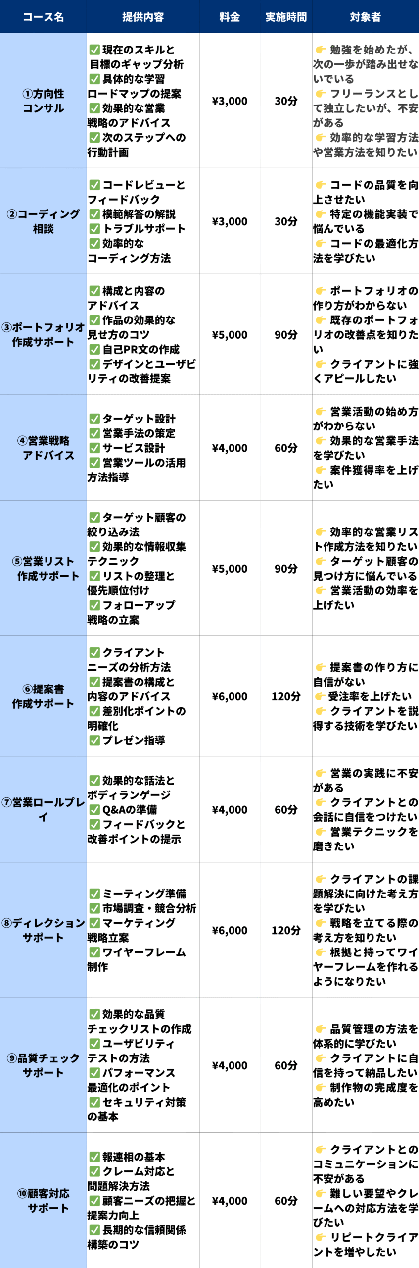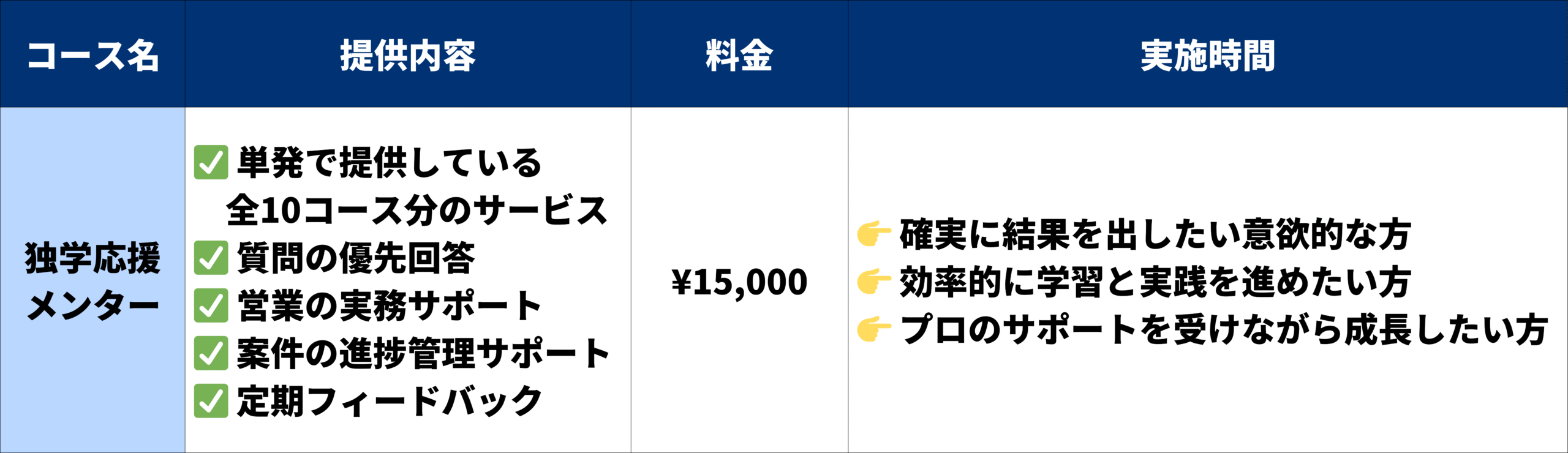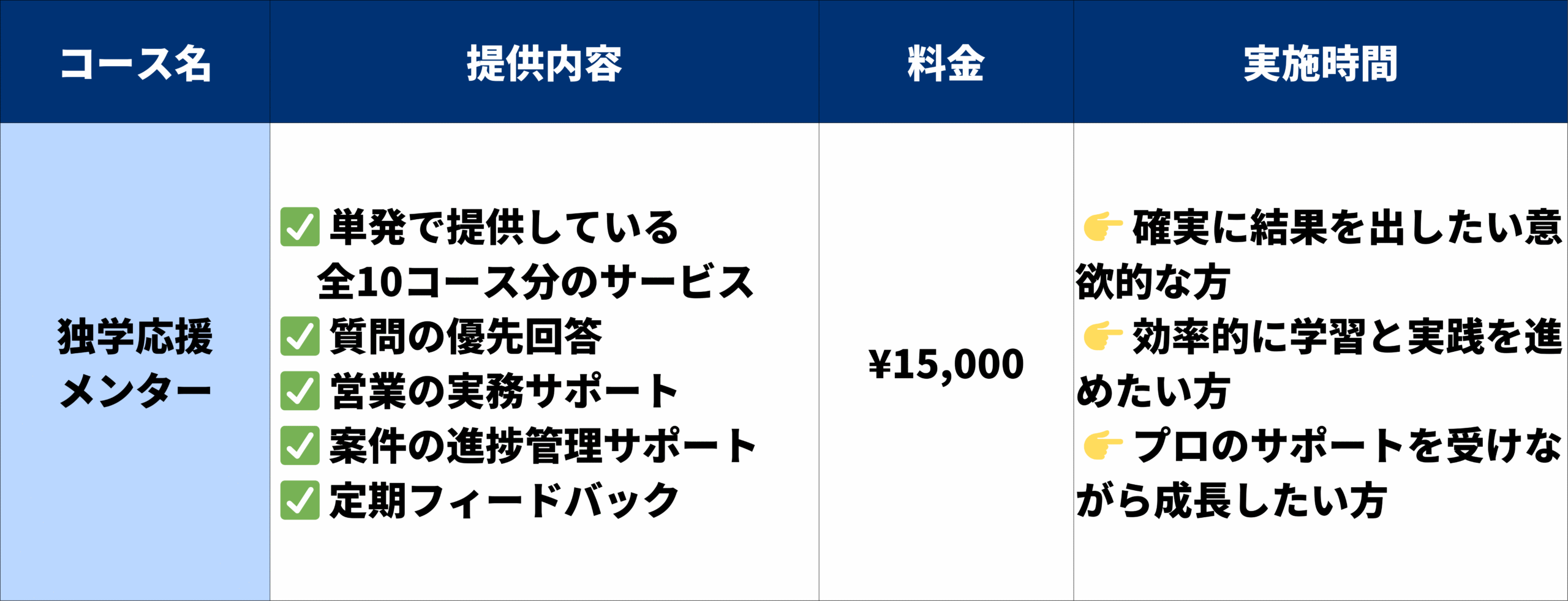 《独学応援メンター》では、それぞれ単発でご利用いただける10種類のコースと、それらをまとめてパッケージ化した月額コースの全11コースを提供しています。